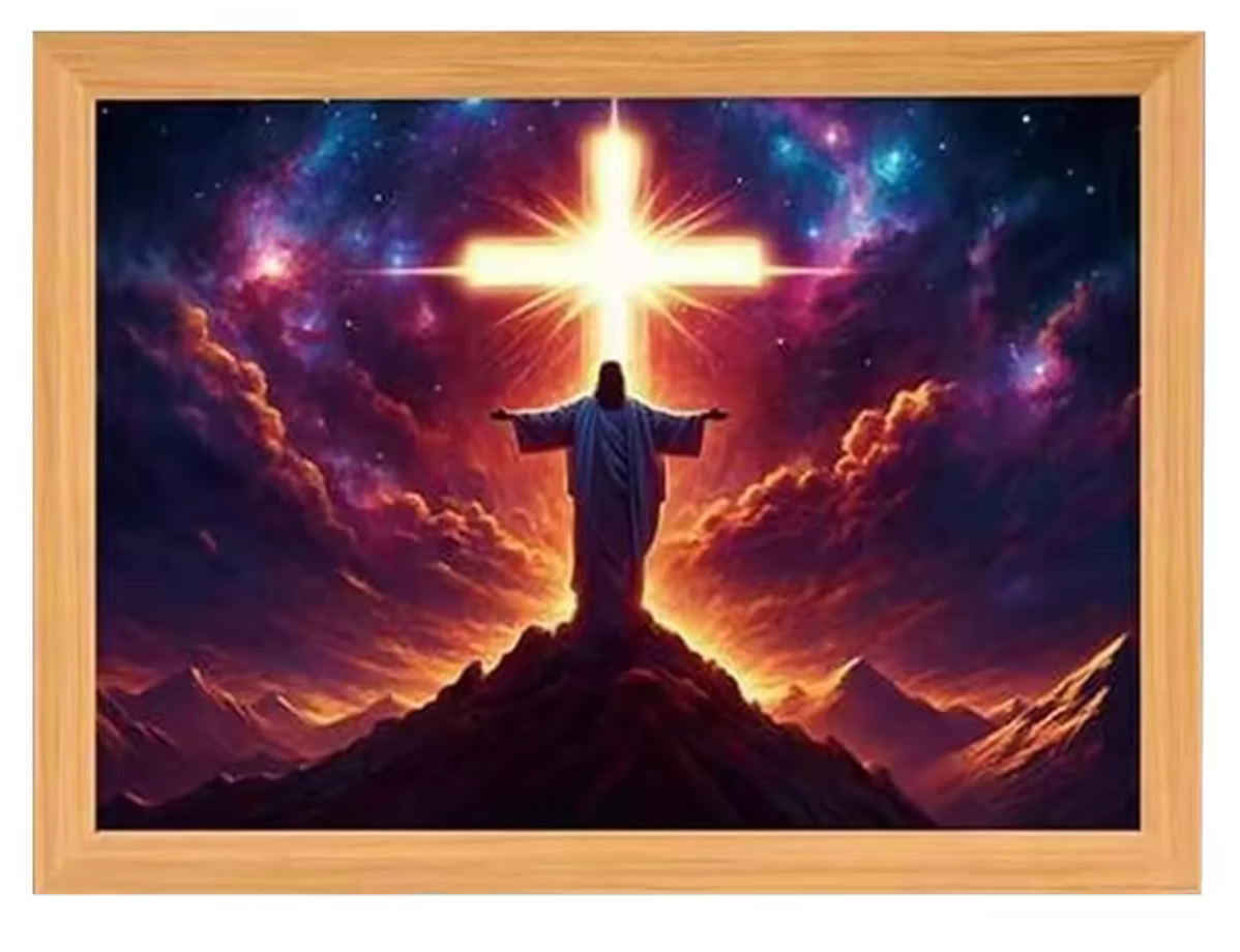 Au sommet d'une montagne, le Christ se dresse, les bras ouverts face à un ciel cosmique et vibrant. De ce spectacle grandiose émane une croix de lumière, rayonnant sur un paysage tourmenté. Cette œuvre symbolise la transcendance du sacrifice du Christ, un geste éternel qui unit le ciel et la terre.